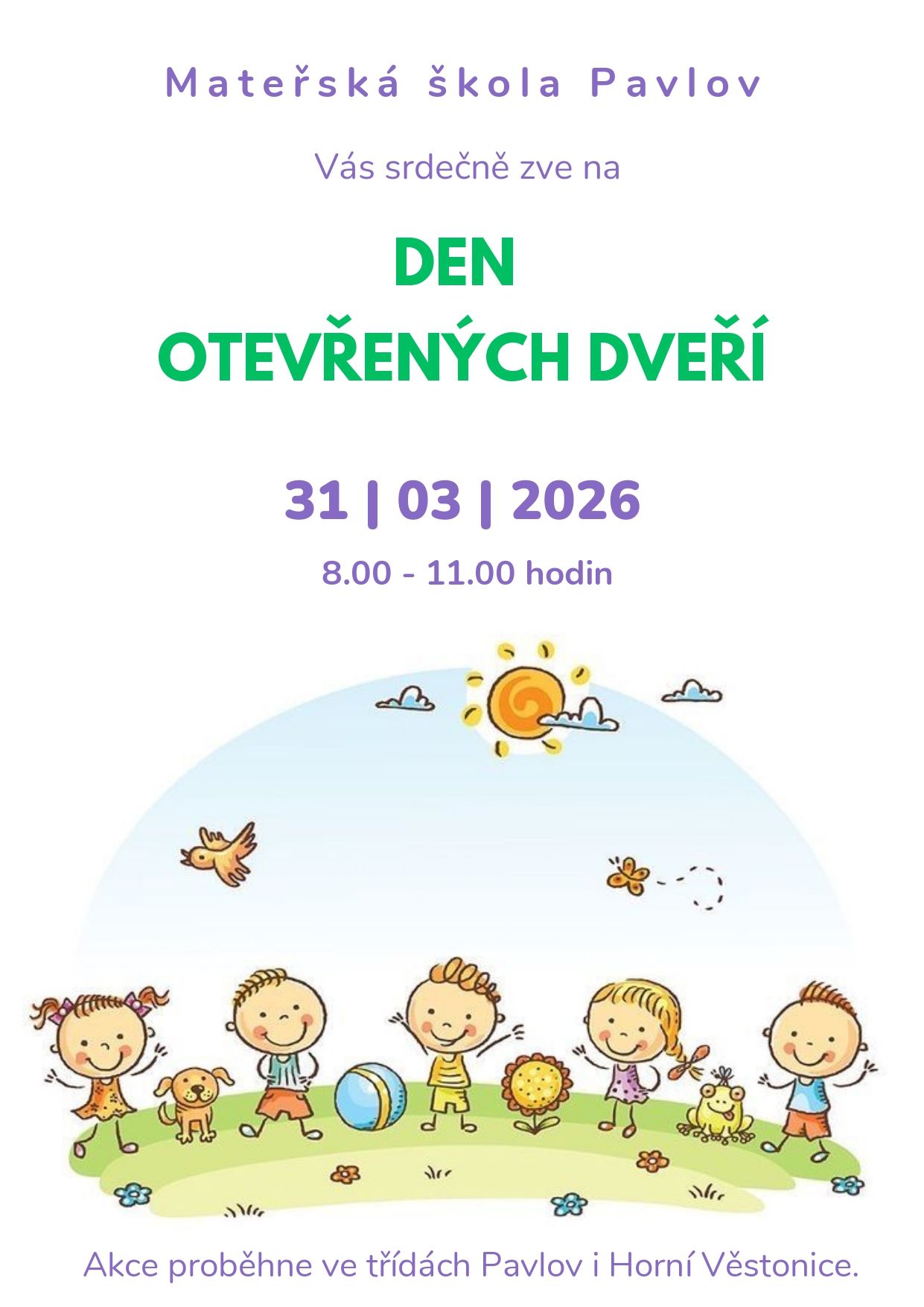 Mateřská škola Pod Pálavou se nachází v Pavlově v Chráněné krajinné oblasti Pálava se zříceninou hradu Děvičky u Novomlýnských nádrží. Její dostupnost je velkou výhodou. Je dvoutřídní, přičemž druhá třída se nachází v 6 km vzdálených Horních Věstonicích. V blízkém okolí obou budov byly nalezeny četné archeologické vykopávky.