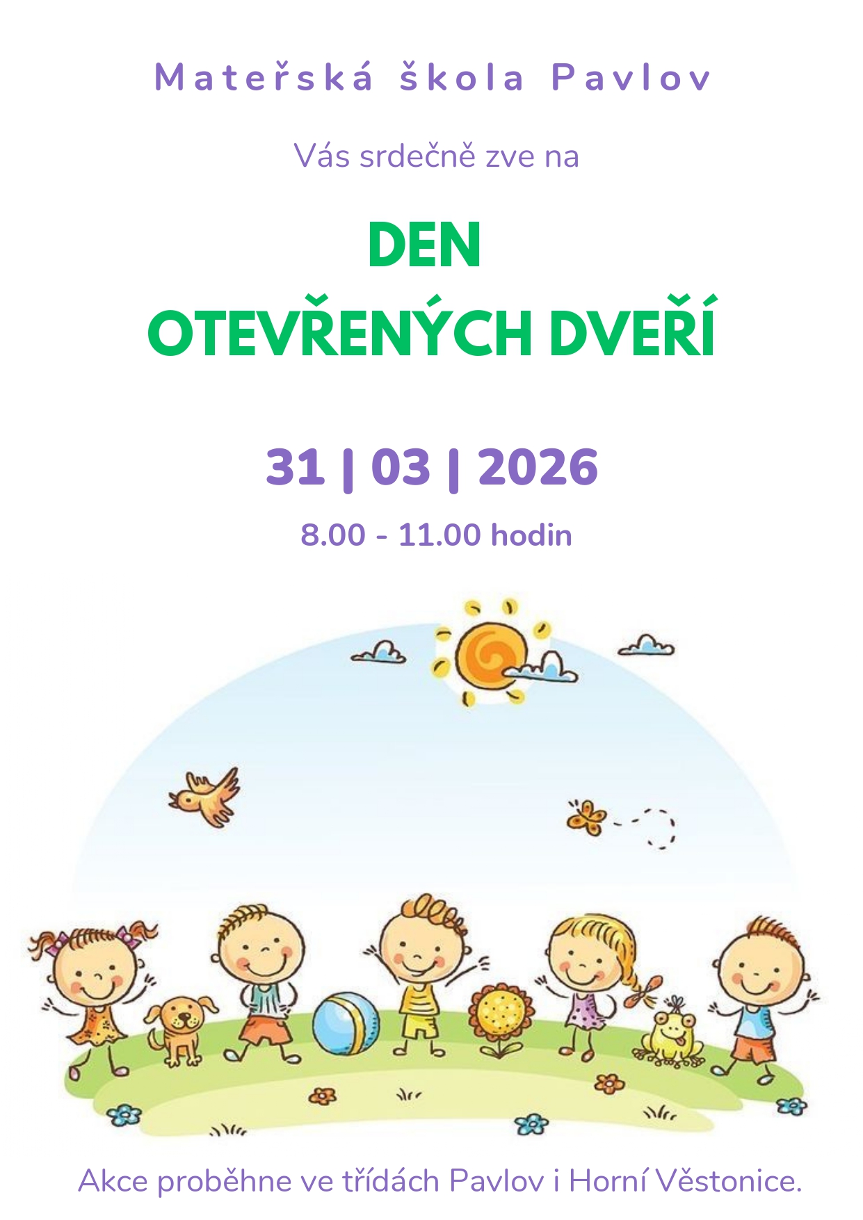 Mateřská škola Pod Pálavou se nachází v Pavlově v Chráněné krajinné oblasti Pálava se zříceninou hradu Děvičky u Novomlýnských nádrží. Její dostupnost je velkou výhodou. Je dvoutřídní, přičemž druhá třída se nachází v 6 km vzdálených Horních Věstonicích. V blízkém okolí obou budov byly nalezeny četné archeologické vykopávky.